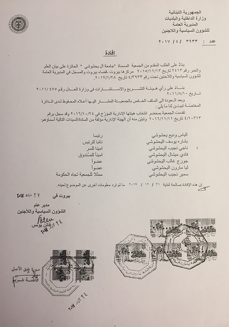 بناءً على الطلب المقدم من الجمعية المسماة "جامعة آل يحشوشي" الحائزة على بيان العلم والخبر رقم 2413 تاريخ 13/11/2015 مركزها بيروت قضاء بيروت والمسجل في المديرية العامة للشؤون السياسية والاجئين تحت رقم 3933/4 تاريخ 28/1/2017